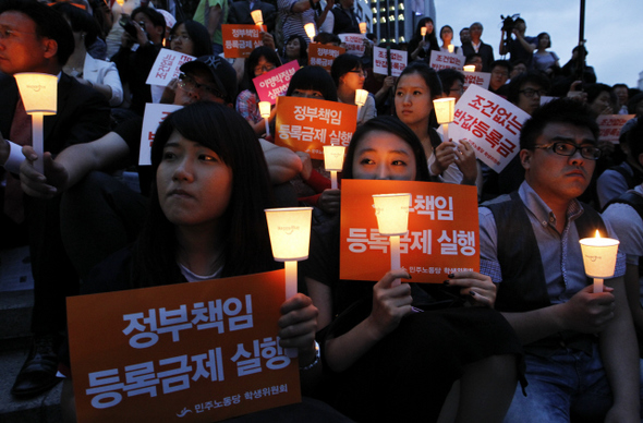 청계광장이 3년만에 붉게 물들었다. 10일 1만5000여명의 학생과 시민들이 '반값 등록금 촛불'을 들었다. 청계광장에 발 디딜틈없이 수많은 시민들이 모인 것은 2008년 이후 처음이다. 등록금 촛불의 주인공인 대학생은 물론 교복을 그대로 입고 나온 고등학생들도 곳곳에서 눈에 띄었다. 30대 이상의 학부모 세대도 청계광장을 가득 메웠다.