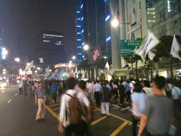 경찰 병력은 밤 11시께 덕수궁 대한문 앞 도로에서 시위대의 행진을 가로막기 위한 바리케이드를 쳤다. 학생과 시민들은 왔던 길을 그대로 되돌아가 명동 방향으로 거리행진을 이어갔다. 밤 11시 30분부터 학생과 시민들은 청계천로 광교 앞 8차선 도로를 점거한채 구호를 외치며 연좌시위를 벌였다. 경찰이 해산경고 방송을 수차례 반복하자 11일 0시 20분께 학생과 시민들은 연좌시위를 종료하고 자진해산했다. 박자은 한국대학생연합(한대련) 대표는 거리행진과 관련해 "학생들은 더 많은 시민들을 만나고 싶었는데 경찰이 도로행진 신고를 받아주지 않아 어쩔 수 없이 학생들이 도로를 점거한 것 같다"고 밝혔다.